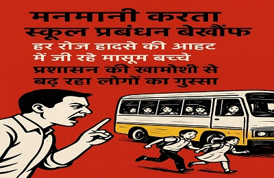 अभिभावकों ने स्कूल प्रशासन के खिलाफ खुलकर विरोध दर्ज कराना शुरू कर दिया है। उनका कहना है कि यदि जल्द ही इस लापरवाही पर अंकुश नहीं लगाया गया तो वे सड़कों पर उतरकर बड़े आंदोलन की राह अपनाएंगे। उन्होंने प्रशासन को चेतावनी देते हुए कहा है कि अगर किसी भी बच्चे के साथ अनहोनी हुई तो इसकी पूरी जिम्मेदारी स्कूल प्रबंधन और जिला प्रशासन की होगी।