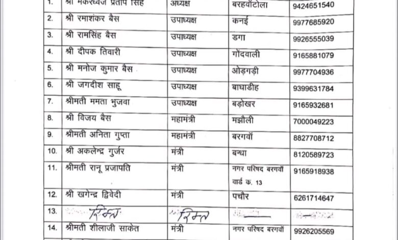 बरगवां मंडल :- मंडल अध्यक्ष मकरध्वज प्रताप सिंह ने अनीता गुप्ता एवं विजय कुमार बैस को महामंत्री नियुक्त किया है। उपाध्यक्ष पद की जिम्मेदारी रमाशंकर बैस, दीपक तिवारी, राम सिंह बैस, जगदीश साहू, मनोज कुमार बैस और ममता भुजवा को सौंपी गई है। अल्केंद्र गुर्जर, रानू प्रजापति, खगेन्द्र द्विवेदी, शीलाजी साकेत और फूलमती विश्वकर्मा मंत्री बने हैं, जबकि मनोज अग्रवाल कोषाध्यक्ष होंगे।