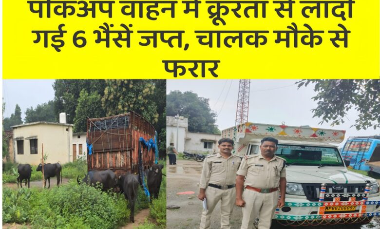 सिंगरौली, मध्यप्रदेश | 15 सितम्बर 2025थाना जियावन प्रभारी निरीक्षक ज्ञानेन्द्र सिंह के निर्देशन में पशु तस्करी व क्रूरता के विरुद्ध चलाई जा रही मुहिम के तहत एक और बड़ी कार्यवाही को अंजाम दिया गया। रात्रि गश्त के दौरान ग्राम डोल में मुखबिर की सूचना पर पीकअप वाहन क्रमांक MP66ZG6097 को रोका गया, जिसमें निर्दयता पूर्वक रस्सियों से बांधकर कुल 6 नग भैंसों को लादा गया था।