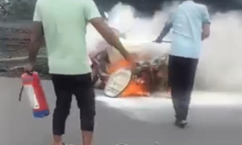 हादसा पेट्रोल पंप के सामने हुआ। पंप कर्मचारियों ने दो अग्निशमन यंत्रों से आग बुझाने की कोशिश की, मगर आग पर काबू नहीं पाया जा सका।
